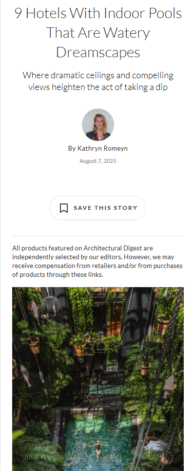 “But step inside and the story is very different… At its epicentre is the indoor pool, lined with day beds and surrounded by greenery like some wonderfully steamy tropical wonderland.“