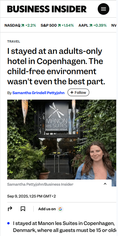 “The two hours I spent at the pool, swimming, sipping wine, and reading, were not only a highlight of my stay at Manon les Suites but of my three-day trip to Copenhagen.”