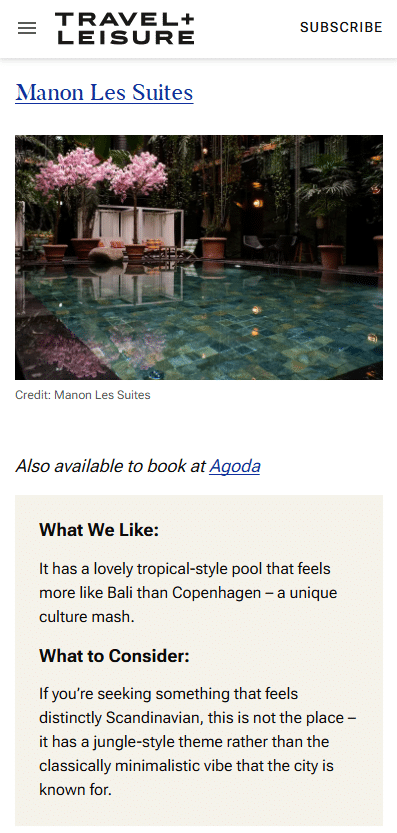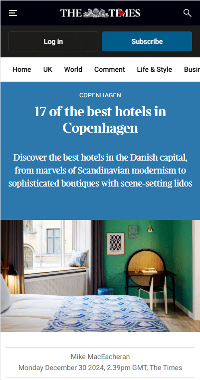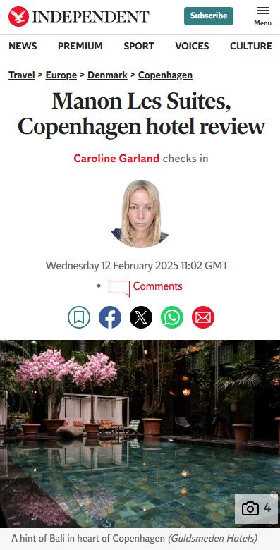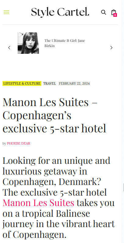 “Manon Les Suites Hotel in Copenhagen stands out among the otherwise rather minimalist hotels in Scandinavia…Anyone looking for a unique boutique hotel that skillfully combines all these elements will find exactly what they’re looking.”